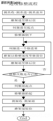 磨床砂轮(刀具)自动化修整是重要并且是必要的数控功能。砂轮在连续磨削零件的时候,砂轮本身也会被磨损,尺寸会发生变化,所以在自动磨零件得时候需加入砂轮的技术性修整(自动磨好若干个零件后修整一次砂轮),砂轮的尺寸变化,零件的磨削起点也得跟着变化,正常情况下,砂轮会修整到磨损砂轮直径的时候自动运转停止,提示换新砂轮。除了自动过程中的技术性修整,连续修整也是必要的,连续修整可以让砂轮直接修整至指定尺寸。砂轮磨损自动补偿流程如图4所示。