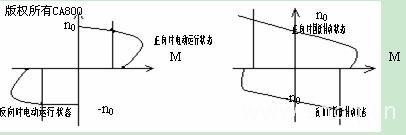 根据工艺要求,转炉的倾动角度为正反360°。转炉炉口和炉底方向轴线与地平面垂直时为零位状态。故炉子倾动负载力矩为角度的函数Mfz=f(θ) ,属于反阴性的位能负载。另外,据工艺设计说明,转炉按正力矩设计,即炉子耳轴下部比上部高,下部比上部重。从而确保转炉电控系统失灵或抱闸力不够时,能靠炉体自身的正力矩来确保炉口向上,这样不至于发生倒钢等事故。但当维修炉拆除炉底后以及炉口粘钢渣太多时,炉体可能出现上部较下部重,由于液体钢水重心随转炉倾角的变化而变化,这样在修炉和出渣或出钢时,可能出现负力矩。当炉体处于正力矩状态时,电动机处于电动运行状态,当炉体处于负力矩状态时,电动机处于回馈制动状态,电动机的机械特性和负载特性如图2 。