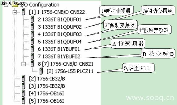根据倾动机构工艺要求及控制功能,每座转炉倾动变频系统配置了一套相对独立的PLC(1#转炉为PLC12)系统,通过控制总线Control Net网络接口实现转炉变频器及PLC间的通讯(如图3), 同时实现与转炉主PLC(1#转炉为PLC11)系统的通讯(如图4)。系统主要硬件配置如下: