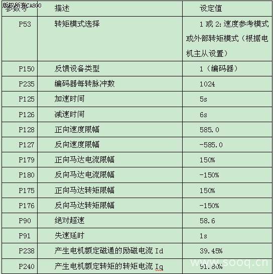 由于变频器功能参数很多,实际应用中,没有必要对每一参数进行设置和调试,多数可采用缺省值,有些参数可以通过做AUTOTUNE后产生,例如:速度调节器和滑差调节器的PID参数、额定转速和额定电流下的Q轴和D轴电压、电机的额定和最大最小滑差频率等等,不需人工设定。而有些参数则要根据电机的负载特性和功能来设定,主要设置的参数为电机铭牌参数,极限参数(包括速度和电流),定标参数,链接参数和通讯口等。另外,更换同型号电机后,可以继续使用原有参数而不需要改变。但反馈类型改变后,由于对整个系统的影响较大,需要重新做AUTOTUNE。根据倾动电机工艺参数和相关特性,表1列出了1#倾动变频器部分参数的设置。