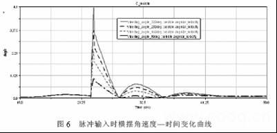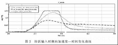 由图4、图5可知,当整车质心位置前移时,横摆角速度峰值及稳态值降低,达到第一峰值的反应时间短,反应快。