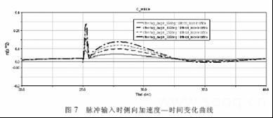 整车模型以一定速度(本例为42km/h)行驶中,突然加方向盘阶跃输入,以尽快的速度(起阶时间不大于0.2s)转动方向盘到150°,分别将整车质心位置前移和后移100mm时横摆角速度、侧向加速度随时间变化曲线。
