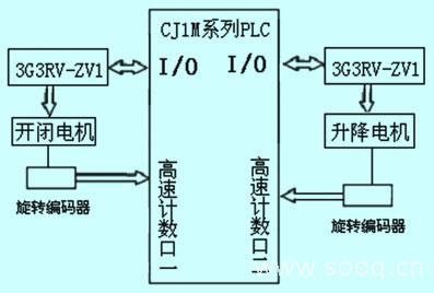 采用欧姆龙公司的cj1m系列plc作为控制核心,用e6c2型旋转编码器检测两个电机的旋转角度,安装在两个电机轴上或卷筒轴上,选用两台3g3rv-zv1系列变频器驱动电机。