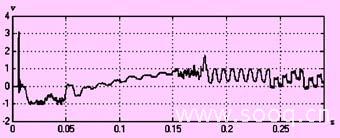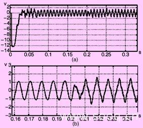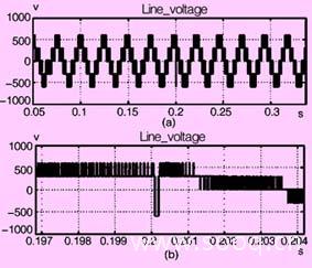 系统运行状态设定:t=0s时给定转速ωr=700rpm=73.3rad/s,空载启动,在t=0.15s时,给定转速ωr=1200rpm=125.6rad/s,t=0.24s时突加负载转矩tl=15n·m。偏差电压滞环设定值δu=1v。图8、9为此种控制策略的波形。