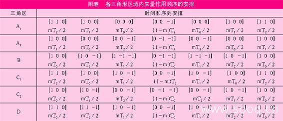 在同样的负载状况下,一对正、负小矢量对中点电位的影响是完全相反的,所以适当的分配这两个矢量的作用时间就可以控制中点的漂移,这就是此种中点平衡策略的核心思想。