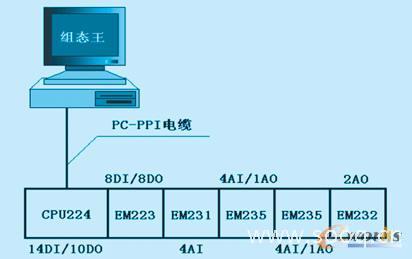 组态软件选择北京亚控公司的组态王6.05。这是一款具有易用性、开放性和集成能力的通用组态软件。组态王使用简单,适合各种简单和复杂的任务。只需要进行填表式操作,即可生成适合于用户的“监控和数据采集系统”,可有效用于控制自动化过程, 组态王6.05版是在Windows2000的平台上运行的,因此选用组态王是较为完善和方便的选择。整个控制系统的构成如图2所示: