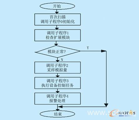 主程序框图如图4所示,其中子程序0为初始化程序,子程序1为检查扩展模块是否正常,子程序2为模拟量采样子程序,子程序3为对各执行设备输出的采样,子程序4为对各被控量和执行设备异常的报警子程序。由于篇幅所限,各子程序框图在此从略。