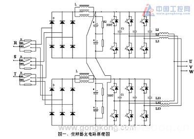 根据现场的特殊要求,经常用在低频2—5HZ,并且提升量大,所以变频器在额定频率0—33.5HZ采用恒转矩输出,33.5HZ以上采用恒功率输出。为适应大功率输出,以及负载根据地质情况的频繁波动,并且电流变化大,而且有频繁的周期性波动,以及现场安装空间的限制,使变频器体积尽量的小。我们采用两单元并联输出,每个单元四个功率模块直接并联的特殊结构,模块并联中产生的均流问题,我们采用均流电抗和强制均流两种方式,使每个模块都能正常工作。由于变频器输出电流大(接近2KA),为防止强电流磁场造成的干扰,传输信号采用光纤通讯,并且控制电路也增加相应的抗干扰措施,从而增加了变频器工作的安全性,收到了较好的效果。