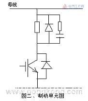 由于在工作过程中负载波动频繁,电流变化大,电机有时处于发电状态,为处理好这部分能量,保证变频器的安全,增加了能耗制动单元。这类负载周期性变化大,我们采用较大余量的功率器件,主电路采用电流传感器取样及IGBT结压降保护和负载过流保护三级措施,来确保变频器及电机能够长期的无故障运行。其主回路电路如图示: