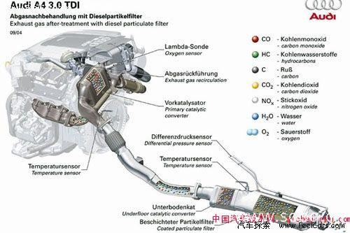 TDI技术使燃油经由一个高压喷射器直接进入汽缸,因为活塞顶的造型是一个凹陷式的碗型设计,燃油就在汽缸内形成一股螺旋状的混合气,这使空气和燃油混合得更为充分,燃烧更加理想,因此不但提高了功率输出,降低了油耗,同时采用氧化型催化反应器,大大降低了CO、HC、颗粒的排放,其中CO2排放与同排量汽油车比可降低30%。另外,采用电子排放控制,包括EGR(废气再循环)系统,大大降低了NOx产生。