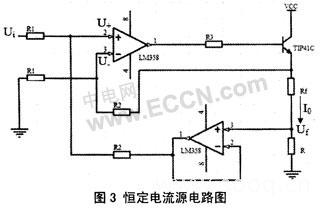 本设计采用集成有运放的线性恒流源。电路由两个低漂移运放LM358、晶体管TIP41C、负载电阻R、限流电阻R3和直径为1mm康铜丝绕制成的电流反馈采样电阻Rf组成,如图3所示。