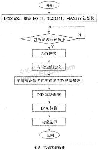基于模块化思想,系统软件设计部分由C语言和汇编语言混合编写而成,发挥了C语言高效运算和快速开发以及汇编语言的灵活的特点。系统软件主要完成输出设定、电流调整等功能。包括主程序、A/D采样子程序、D/A输出电流给定值及按键控制、PID算法子程序、混合最优算法子程序、LCD显示等其他子程序。