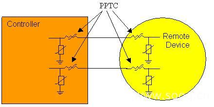 许多驱动器和控制装置均配备了通讯和数据接口,用于各个系统元件之间的信息传输。而这些接口的接线有时会与交流或直流电源电缆并排敷设。这些线束可能由于正常的磨损、意外事故、安装接线错误、或在中央配电箱上进行的误操作,而出现短路现象。如果电源电缆与通讯电线出现短路现象,PolySwitch器件能够保护任何与这条短路线路相连接的系统以免造成通讯接口的损坏。在某些情况下,这种现象有可能影响到很多系统。而PolySwitch器件在保护接口处所起的作用,可以明显地降低设备常见故障的停运时间和修理成本。