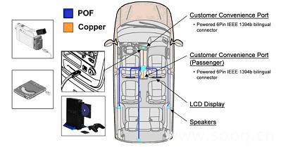 如图所示,车载网络的架构可分为内嵌式网络和用户便利端口(CCP)。目前的技术规格将内嵌式塑料光纤(POF)车载网络定义为与现有的MOST(媒体定向系统传输)技术相似的规格。但是,前者的架构更加稳固、能够提供更高的数据传输速率,并且更易于实现。这个网络能够连接各种电子设备,例如DVD播放机、视频显示屏、导航系统、收音机接收设备、通讯设备,如无线电话或应急自动远程通信及信息处理技术术语,以及其它的多媒体应用。
