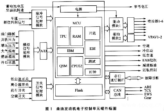 高压共轨柴油发动机电子控制单元是一个集高压共轨燃油喷射控制、实时数据采集及发动机监控保护、故障诊断、通信等于一体的发动机电子管理系统。其典型的功能框图如图1所示.