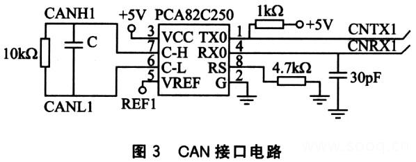 MPC555集成了双路CAN2.0B控制器模块,在ECU设计时只需增加一个收发器就可以完成高速通信。本方案采用Philips公司的PcA82C250收发器,其传输速率高达1 Mbps。图3为其接口电路。