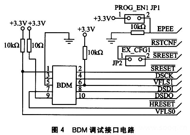 为了进行在线仿真调试及程序固化,MPC555提供了JTAG及BDM接口。采用WindRiver的VisionPibe仿真器,其BDM接口电路如图4所示。