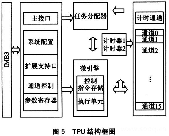 时间处理单元(TPU)是一个智能化、半独立的微控制器,专门进行高分辨率的实时控制。由于它具有自己的执行单元(微引擎)、微代码程序ROM、数据存储器RAM及双定时基准,不需要RCPU的干预即可以执行相应的控制功能。MPC555具有多达32路可独立工作的TPU通道,每个通道可与预分频器中的两个16位计数器中的任何一个同步,其分辨率最小可以到100 ns。通过特定功能的设定,这些通道也可以连在一起,如一个通道的操作作为另一个通道的基准,从而实现多通道的相互协作控制,这一点尤其适合柴油发动机的多缸喷油控制。TPU的结构框图如图5所示。