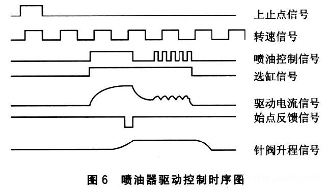 喷油器功能的实现离不开喷油器电磁阀的快速响应。电磁阀理想的驱动特性是,在需要衔铁吸合时,应对电磁阀线圈尽快地注入峰值电流(驱动电流近20 A),使其迅速吸合。一旦吸合,因磁路中气隙减小,磁阻降低,电磁阀仅需较小的电流就可以可靠地维持吸合。在释放时,为减少电磁阀的释放延时应尽快切断驱动电流。图6为常用的喷油器驱动控制时序图。
