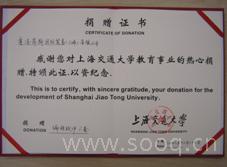 上海交通大学颁发给中国Pro-face的捐赠证书