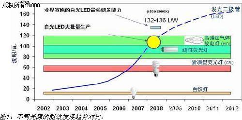相比较而言,LED是一种新兴的光源技术。最常见的白光LED是镀磷(激发时会发黄光)的蓝色LED。LED拥有着越来越高的能效,业界近期宣称的最强的白光LED研发能力达到了132至136 lm/W,色温达(4,500-6,000K)。实际上,近年来,业界在将LED用于通用照明市场的兴趣不断增加。对于通用照明而言,LED拥有众多具有吸引力的特性。例如,它本质上是一种低压器件,它们体积小巧,产生定向光,能够产生多种色彩以及白光。它们产生红外(IR)或紫外(UV)辐射,而且由于它们是固态器件,它们在机械上很强固并且不含汞,在恰当地设计和使用时能够具有超过5万小时的工作寿命周期。与寿命为1千小时的标准白炽灯相比,LED的寿命就要长得多。对于需要长时间连续工作、可能的用量有限、拥有很多极端应用环境的照明应用而言,或者是在地理上难于接近或故障停机成本高昂的应用中,LED的这些特性就特别具有吸引力。这样一来,高亮度LED已经在多种应用中开始替代白炽灯;其中白天可见的应用包括汽车中央停车警告灯和交通信号灯。