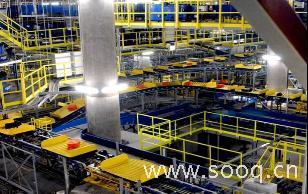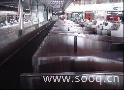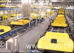 高速托盘系统是近年来逐渐成熟的新兴技术,具有速度快,跟踪准确,成功分拣率高的特点。西门子特有的高速系统,将行李自动装载到特别设计的托盘内,再由一种双带式输送机进行高速传输。同时它也将RFID 集成在托盘上,有效的实施行李的全程跟踪,监控和分拣,精度高达99.9%。另外,托盘系统使用可靠性很高,即使单个托盘发生故障,也可通过控制系统导入维修站,不会对整个系统运行造成影响。行李的传输速度只需5秒就能加速到10m/s,最高速度可达12 m/s,并将噪音控制到最低。