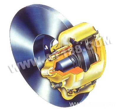 盘式制动器又称为碟式制动器,顾名思义是取其形状而得名。它由液压控制,主要零部件有制动盘、分泵、制动钳、油管等。制动盘用合金钢制造并固定在车轮上,随车轮转动。分泵固定在制动器的底板上固定不动,制‘动钳上的两个摩擦片分别装在制动盘的两侧,分泵的活塞受油管输送来的液压作用,推动摩擦片压向制动盘发生摩擦制动,动作起来就好像用钳子钳住旋转中的盘子,迫使它停下来一样。