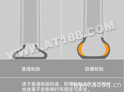 防爆轮胎采用两侧加强技术和阻燃橡胶材质,即使轮胎受损,仍可让您继续行驶。利用这种特殊的结构,防爆轮胎甚至还可以提高汽车的灵活性和驾驶动态,优于普通轮胎的是,防爆轮胎在气压下降时也丝毫不会影响行车稳定与安全。即使所有的气都跑光,BMW防爆轮胎依然能带您安然驶向修理厂,在轮胎气压为0的情况下,它仍然可以以80公里/小时的速度,继续行驶150公里。