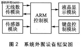 下位机以ARM7微控制器为核心,利用ARM7内核对外围设备,包括无线数传模块、LCD显示模块、模拟/数字信号输入、键盘扫描,进行控制和管理,基本框架如图2所示。