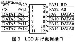 AT91SAM7S64并行输入输出控制器(PIO)管理多达32个全可编程I/O线。对于LCD显示屏的控制,实际上是根据SED1335控制器的时序进行操作,即通过PIO控制器控制并行数据输出。