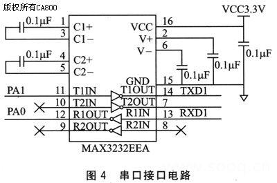 AT91SAM7S64的USART,支持与使能由发送器到接收器的数据传输的外设数据控制器的连接,可管理多类型串行同步或异步通信。推焦车上的下位机通过USART口同无线数传电台模块通信,控制电台接收和发送数据,相关接口的核心芯片是MAX3232EEA,具体电路如图4所示。