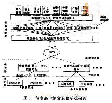 第二种方法有现成的支持标准(SNMP/CM IP /CORBA)互操作的静态规范描述和动态交互式转化方法,适用于信息量不大的情况。第三种方法是比较彻底的综合网管方法,但需要将所有的网管系统被统一标准替换,故暂时还只是一个想法。本文提出的信息集中监控解决方案主要针对故障信息进行处理,而且为了避免各厂商间的交涉,将采用综合化方法,做到与原有网管系统的平滑过渡;这也与那些通过简单整合就可以实现集中监控的系统的做法很类似,系统也比较容易整合。这样,在各系统原有管理系统或网管系统的基础上再添一层管理者,在新的管理层上实现信息集中综合监管,从而解决了各系统间的“信息孤岛”问题。