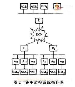 图2是以某地铁线为例的集中监控系统拓扑图。其中A11是从传输网管NM11,采集数据的代理PC ; A12是从自动售检票管理系统NM12采集数据的代理PC。所有系统经代理PC采集数据后,通过路由器R,把数据送到数据库服务器DS。其他地铁线的拓扑都与该线类似。MIS1 , MIS2,MIS3凡等是信息集中综合监管系统。比如MIS1管理1一4号线,MIS2管理5一9号线,MIS3管理10一13号线。MIS1—MIS3对数据库服务器中的数据进行综合处理、显示、告警,以及统计和分析。MIS1一MIS3放在一起,这样在多个处理机上进行监管可以扩大可视范围,也达到综合监管的目的。