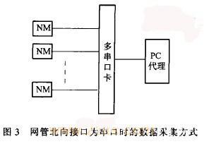 设备网管所提供的北向接口,有的是Q3接口,可以通过网口进行采集;有的是串口,可以通过串口接收。如果通过串口接收数据,可以根据图3所示,用一个1-8多串口卡,使用一台代理PC机进行多个串口数据收集。