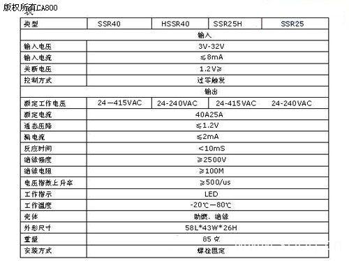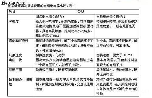 3)固态继电器产品特点: ●过零触发,投入时无浪费电流,分断时不产生高压,大大延长电容器的使用寿命。 ● 投入不产生火花,抖动等瞬态现象 ● 二个反并联晶闸管和电压过零触目惊心发电路组成的无触心点式电子开关响应速度快。 ● 采用进口玻璃钝化方形芯片,SBC陶瓷板以用各种导热绝缘材料封装而成,模块一致性能好,工作可靠性高。 ● 输出功率大,输出额定电流最大可达1000A晶闸的VDRM和VRRM达2200V。 ● 输入/输出端与模块铜底板之间的绝缘耐压VISO≥2.5KV(RMS),光藕隔离,强/弱电之间的绝缘耐压达成7.5KV. 固态继电器与常规使用的电磁继电器比较:表二