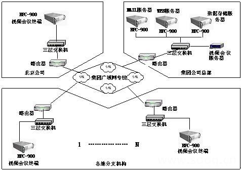 此视频会议系统采用RJ-45端口,IP方式连接,多点视频会议服务器通过交换机和路由器与计算机广域网络连接,通过数字传输信道,以专线方式星形级联而成。