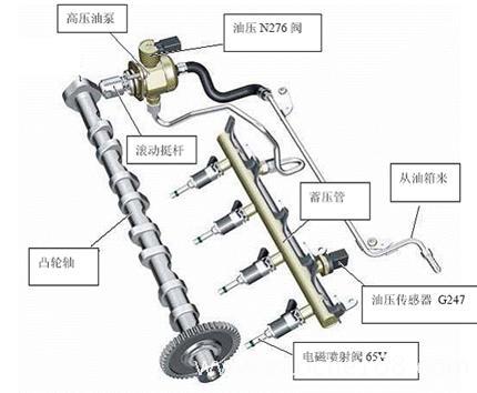 其次,再介绍一下燃油精确控制概念,这是其省油的另一秘诀。在此款TFSI直喷燃油发动机中,进气凸轮轴端部四边形结构的一周旋转在滚动挺杆的作用下实现了高压泵的四次往复运动,并且在油压阀和行车电脑的精确配合下,实现了不同工况不等量燃油的缸内喷射过程。燃油精确控制概念是指在高压泵进行一次往复运动的过程中,行车电脑会根据当前工况条件控制燃油控制阀适时打开和关闭燃油高压泵的进口阀。在高负载工况下,燃油控制阀会在高压泵的吸油过程结束后进行压缩过程时及早关闭高压泵的进口阀并打开出口阀,将较多的燃油通过电磁喷射阀喷射到缸内。而在低负载工况下,燃油控制阀会在高压泵的吸油过程结束后进行压缩过程时,在行车电脑的控制下保持高压泵的进口阀的开启状态和出口阀的闭合状态,将过多的燃油通过高压泵进口阀排回到从油箱来的储油管中。而在随后的进口阀闭合和出口阀开启状态下,保证缸内做功所必须的燃油还会喷射到缸内。这种受精确控制的缸内直喷必然节省大量燃油的消耗。