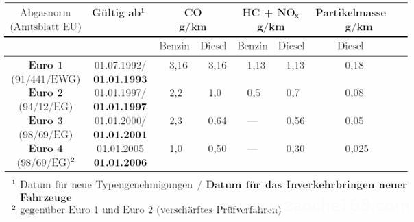 从以上表格中可以看出对汽油发动机欧3排放标准是在2001年1月1日在欧盟国家开始实施,其标准为一氧化碳每公里排放2.3克。而欧4排放标准是在2006年1月1日在欧盟国家开始实施,其标准为一氧化碳每公里排放1克。