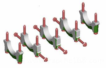 目前市场上传统发动机每个轴瓦上有两个螺栓,实现轴瓦在缸体上垂直方向的固定;此款新型发动机在此基础上又多加了六个螺栓,增加了轴瓦在缸体上水平方向的固定。这种结构设计不仅减小轴瓦径向窜动,而且增加了发动机的刚性从而减小其震动。