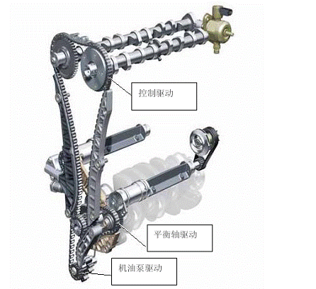 在EA888系列1,8TFSI涡轮增压燃油直喷发动机上,曲轴和凸轮轴的控制传动,曲轴和平衡轴的传动,曲轴和机油泵的传动都是由链条完成。这种链条传动替代了传统的皮带传动,从而免去烦琐的维护和更换工作。