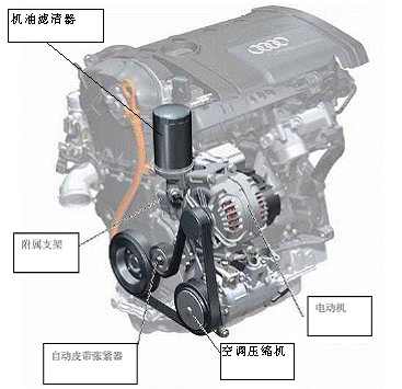 此外此款新型发动机仅用一个铝合金附属支架承载着发电机、空调压缩机、自动皮带张紧器、机油滤清器。这种结构设计与目前市场上传统的每个零件都有一个支架的发动机相比,不但节省了零件降低了造价,并且节约了安装空间,且便于更换。