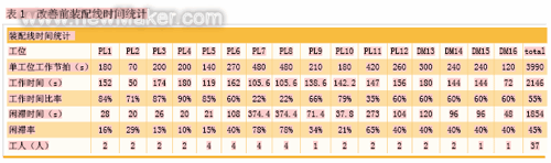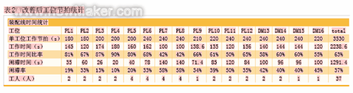 经过为期两个月的改造,生产线平衡较改进前有较大提高,编成效率由51%上升至92%,最长工序时间由480s降至240s,单车总装配时间由3990s下降至3530s,线速提高了一倍,在设备正常的情况下可以完成8h单班产量120。