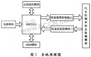 系统主要由ARM嵌入式控制器、手机模块、无线遥控模块、汽车控制和状态检测模块4部分组成。汽车控制和状态检测模块将车辆相关数据采集给ARM嵌入式控制器,ARM嵌入式控制器再将其传给手机模块和无线遥控模块,最终达到报警的目的。系统原理如图1所示。
