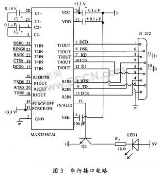 GSM模块和系统处理器通过串行TIU TRS 232标准串行总线进行数据交换。所有操作的高电平都是CMOS电压(2.65 V),因而,RS 232转换芯片的逻辑电平必须采用低压供电形式(3.3 V),不能用5 V的串口转换芯片。在设计中选用了MAX公司的MAX 3238实现数据转换。MAX 3238是MAX公司生产的3.3 V逻辑电平串行转换芯片,和常用的MAX 232具有相同的特性,只是逻辑电平是3.3 V。模块和处理器的串行通信完全符合通用串行总线标准。具体硬件接口电路如图3所示。