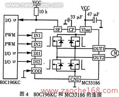 本系统的处理器采用的是16位的80C196KC单片机。节气门电机的驱动芯片采用的是摩托罗拉公司的汽车专用驱动芯片MC33186,其负载电流为5A,可以满足节气门电机电流驱动要求。