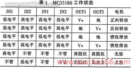 MC33186的INl和IN2既控制电机的转速又控制电机的方向。如果想要电机正向旋转.就向 INl施加一个PWM信号,而将IN2置为低电平。如果想使其反向旋转,就将INl置为低电平.而向 IN2施加一个PWM信号。PWM信号的占空比决定了电机的速度,实现起来很方便。把D11置为低电平,把D12置为高电平,电机正常工作:把D11置高或者把D12置低都可以使电机停止转动.也就是使电机刹车。表l给出了INl、IN2、D11和D12是如何影响电机工作的。