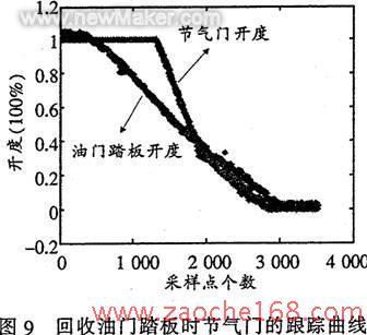 图8、图9分别为踏入油门踏板和回收油门踏板时节气门的跟踪曲线。从图8看出踏入油门的跟踪过程中.同一时刻节气门开度值比油门踏板开度值小一些、节气门要滞后油门踏板一些,属于正常跟踪。从图9看出回收油门的跟踪过程中,当油门踏板开度较大时节气门开度值比油门踏板开度值大,节气门要滞后油门踏板,是在允许的滞后,范围内,属于正常跟踪。从台架的节气门的动作效果来看,跟踪效果很理想。