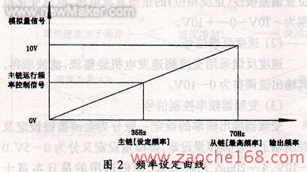 悬链系统在运行时,由于扰动的作用,每条悬链的速度随时都在发生变化,虽然有速度反馈环节来稳定速度的变化,但当突加扰动量较大时,可能造成主从链相对位置偏差变大,而系统要求主从链出现位置偏差时控制系统能够进行快速调节,使偏差尽快趋于零。在直流调速系统中,从理论上讲可以采取增大放大器线性工作区来提高系统的快速性,但是实际上做起来有很多困难,而采用变频器调速却很容易做到这一点。在调试过程中,可根据系统运行情况,适当提高从链变频器[最高频率]设定范围,当受控模拟量信号有较小变化时,变频器输出频率就有较大响应,从而提高了系统调节的快速性。本系统变频器频率设定如图2。