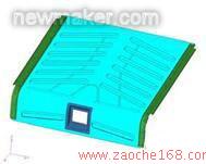 如前分析,后掀门的在进行强度计算时,最大应力为 598Mpa。强度不能满足设计要求。但是为了不增加重量,不能采取传统的增加料厚的方法提高强度。钣金件设计中,加筋是一个提高结构强度的很有效方法。而 OptiStruct软件提供了强大的拓扑形貌优化工具。针对钣金件加筋优化设计,其可以定义起筋的方向,筋的高度,拔模角等参数,并且一定方式进行筋分布,如平行阵列、对称阵列、循环对称阵列。因此针对某越野车后掀门结构强度不足的问题。在进行结构优化改进设计时采取加筋的方法。进行优化时,以单元应力作为优化目标,这样就成为一个 minmax优化问题。定义加筋的优化变量时,使加强筋沿着 XZ平面对称,并沿 X方向平行分布。按照上述定义进行优化分析处理,并考虑到工艺和实际设计的边界条件,重新设计的结构如图所示。=