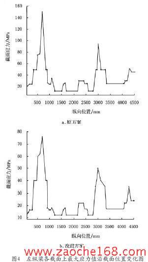 Von Mises stress 是综合的概念,考虑了第一第二第三主应力,可以用来对疲劳、破坏等评价。对以上模型用ANSYS 进行分析计算[15],分析结果的Von Mises stress节点应力云图如图3a 所示,最大应力206.864 MPa,这是由于发动机和变速箱重力简化为集中力加在发动机支架上而造成的。排除建模的不完善因素所引起的局部应力集中和在各个支架与纵梁的连接区会出现由于结构和工艺原因而造成的局部应力奇异异常应力值外,纵梁上应力较大的区域在n、p 附近,由于从n 到p 段截面尺寸变化大和受到大的扭矩扭转作用,使得危险截面出现在纵梁上靠近前悬架支架的位置附近,其中最大应力约150 MPa,在板簧前支架附近应力也较大(约100 MPa)。排除建模不完善所产生的应力值,左纵梁各横截面上最大Von Mises stress 应力值沿纵梁长度方向的变化情况如图4a 所示,相对于n 处,p 附近应力变化更快,由此认定p 附近为危险区域。事实上,纵梁截面形状在p、q 之间发生双向变化,且驾驶室第二对支架上载荷在此处产生的扭转作用也很大。